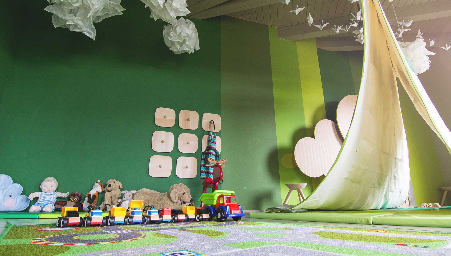 Locul de joaca este compus dintr-un spatiu interior de aproximativ 30 mp si un ansamblu de joaca exterior, amplasat pe o pajiste cu multa iarba, unde copii se pot juca in deplina siguranta sub atenta privire a parintilor, care se pot relaxa in spatiul frumos amenajat in aproprierea acestora.